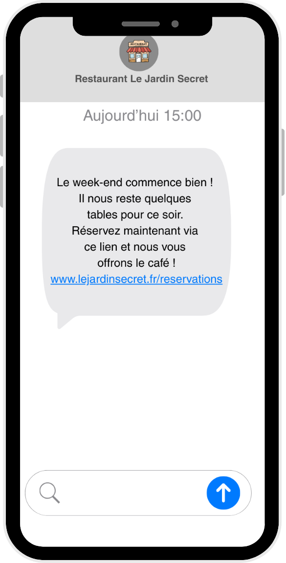 - Description : L'idée est d'utiliser le canal le plus immédiat qui soit, le SMS, pour une offre impulsive visant à combler vos dernières tables vides. Un exemple parfait serait un SMS envoyé le vendredi à 13h : "Le week-end commence bien ! Il nous reste quelques tables pour ce soir. Réservez maintenant via ce lien et nous vous offrons le café."